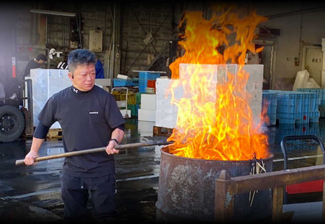 丸正水産では、自家製の藁を使用し、鰹の表面を高温で素早く焼き上げる「藁焼き」で鰹のたたきを仕上げています。この藁焼きにより、余計な脂分や臭みが消えると共に、藁の香りが鰹の旨味・風味を引き立て、食欲をそそります。